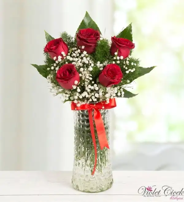 CAM VAZO İÇERİSİNDE 5 ADET GÜLDEN OLUŞAN GÜZEL BİR ÇALIŞMA
