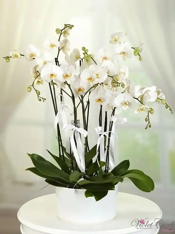 seramik vazo içerisine hazırlanmış 8 dal beyaz orkideler