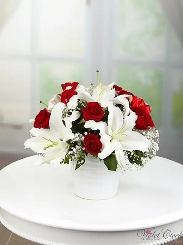 seramik vazoda hazırlanmış 7 adet kırmızı gül ve beyaz kokulu lilyumlar