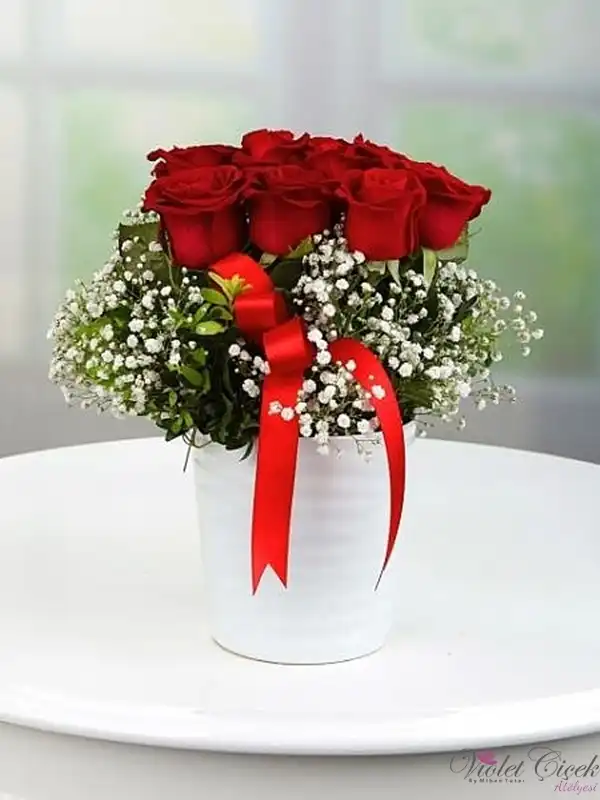 seramik vazo içerisine hazırlanmış 9 kırmızı gül
