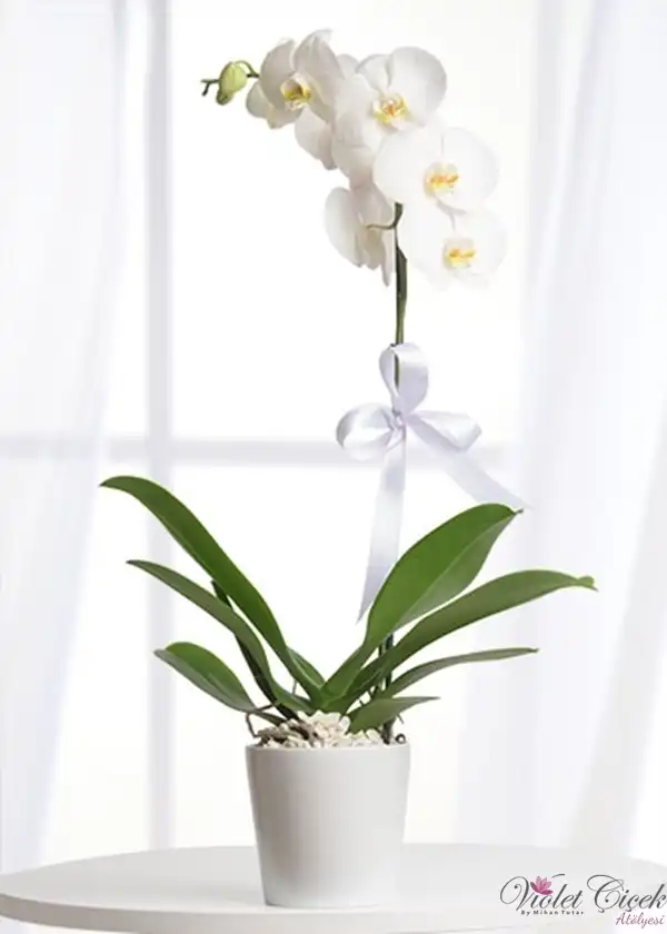 seramik vazo içerisinde beyaz tek dallı orkide