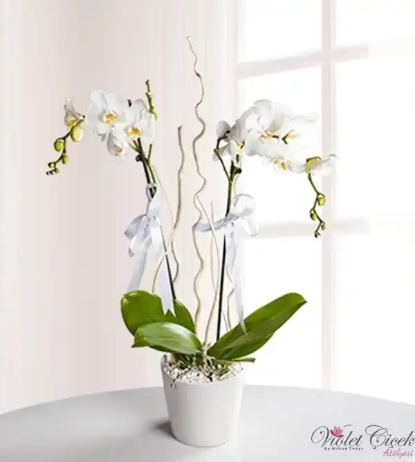 Seramikte Çift Dallı Beyaz Orkide beyaz orkide çift dallı orkide orkide çiçeği orkide siparişi seramik saksı orkide izmir orkide balçova çiçekçi konak çiçekçi online çiçek siparişi