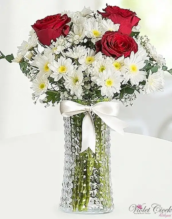 Vazoda Krizantemler Ve 3 Kırmızı Gül